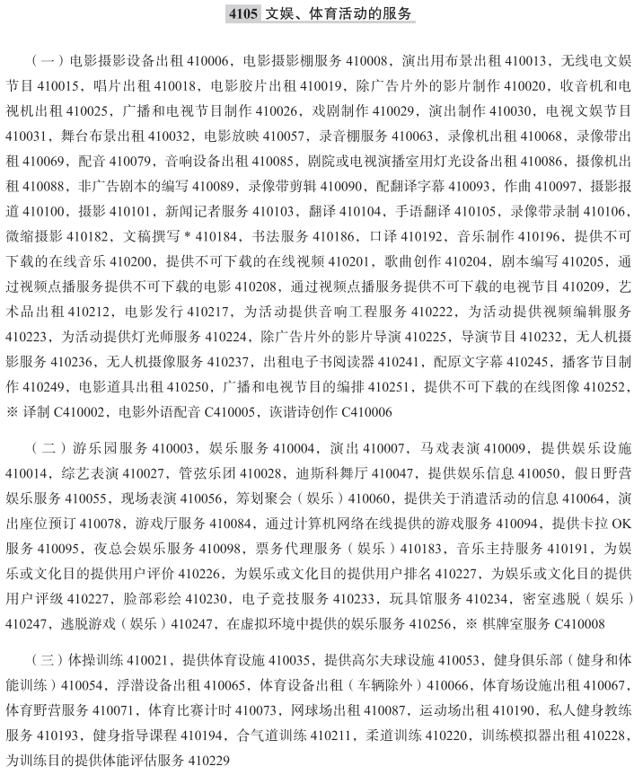 游乐园服务410003; 娱乐服务410004; 电影摄影设备出租410006; 演出410007; 电影摄影棚服务410008; 马戏表演410009; 演出用布景出租410013; 提供娱乐设施410014; 无线电文娱节目410015; 唱片出租410018; 电影胶片出租410019; 除广告片外的影片制作410020; 体操训练410021; 收音机和电视机出租410025; 广播和电视节目制作410026; 综艺表演410027; 管弦乐团410028; 戏剧制作410029; 演出制作410030; 电视文娱节目410031; 舞台布景出租410032; 提供体育设施410035; 迪斯科舞厅410047; 提供娱乐信息410050; 提供高尔夫球设施410053; 健身俱乐部(健身和体能训练)410054; 假日野营娱乐服务410055; 现场表演410056; 电影放映410057; 筹划聚会(娱乐)410060; 提供博物馆设施410062; 录音棚服务410063; 提供关于消遣活动的信息410064; 浮潜设备出租410065; 体育设备出租(车辆除外)410066; 体育场设施出租410067; 录像机出租410068; 录像带出租410069; 体育野营服务410071; 体育比赛计时410073; 演出座位预订410078; 配音410079; 游戏厅服务410084; 音响设备出租410085; 剧院或电视演播室用灯光设备出租410086; 网球场出租410087; 摄像机出租410088; 非广告剧本的编写410089; 录像带剪辑410090; 配翻译字幕410093; 通过计算机网络在线提供的游戏服务410094; 提供卡拉OK服务410095; 作曲410097; 夜总会娱乐服务410098; 摄影报道410100; 摄影410101; 新闻记者服务410103; 翻译410104; 手语翻译410105; 录像带录制410106; 微缩摄影410182; 票务代理服务(娱乐)410183; 文稿撰写410184; 书法服务410186; 运动场出租410190; 音乐主持服务410191; 口译410192; 私人健身教练服务410193; 健身指导课程410194; 音乐制作410196; 玩具出租410197; 游戏器具出租410198; 提供不可下载的在线音乐410200; 提供不可下载的在线视频410201; 歌曲创作410204; 剧本编写410205; 导游服务410206; 通过视频点播服务提供不可下载的电影410208; 通过视频点播服务提供不可下载的电视节目410209; 合气道训练410211; 艺术品出租410212; 登山向导服务410214; 电影发行410217; 柔道训练410220; 武术训练410220; 为活动提供音响工程服务410222; 为活动提供视频编辑服务410223; 为活动提供灯光师服务410224; 除广告片外的影片导演410225; 为娱乐或文化目的提供用户评价410226; 为娱乐或文化目的提供用户排名410227; 为娱乐或文化目的提供用户评级410227; 训练模拟器出租410228; 为训练目的提供体能评估服务410229; 脸部彩绘410230; 导演节目410232; 电子竞技服务410233; 玩具馆服务410234; 无人机摄影服务410236; 无人机摄像服务410237; 出租电子书阅读器410241; 配原文字幕410245; 密室逃脱(娱乐)410247; 逃脱游戏(娱乐)410247; 播客节目制作410249; 电影道具出租410250; 广播和电视节目的编排410251; 提供不可下载的在线图像410252; 提供在线虚拟导游410253; 提供实境角色扮演游戏设施410254; 为娱乐目的在虚拟环境中提供模拟旅行服务410255; 在虚拟环境中提供的娱乐服务410256; 供人娱乐用具有交流和学习功能的拟人机器人的出租410259; 为娱乐目的提供情绪发泄屋410264; 体育解说服务410265; 体育活动器械出租410266; 掌上型电子词典出租410268; 袖珍电子翻译器出租410269; 桨式冲浪板出租410270; 无人机灯光秀表演410271; 译制; 电影外语配音; 诙谐诗创作; 棋牌室服务; 公园; 植物园; 植物展览; 天文馆服务; 画展服务; 艺术展览; 马术训练; 板式网球场出租; 提供演出剧院设施; 为演出出租剧院; 戏剧演出设施出租; 音乐厅出租; 娱乐厅出租; 足球比赛(娱乐); 娱乐(水上公园和娱乐中心); 电影歌曲制作; 体育比赛裁判; 为儿童提供游戏场所; 棒球比赛(娱乐); 高尔夫球锦标赛(娱乐); 篮球比赛(娱乐); 曲棍球比赛(娱乐); 导演科幻电影; 高尔夫球器材出租; 通过互联网方式提供的电子游戏服务; 影片出租; 电视机出租; 动画片制作服务; 唱片发行; 广播节目制作; 配音服务; 影片和录像带出租服务; 电影院的电影放映; 电影剧本编写; 健身咨询; 博物馆服务; 提供田径设施; 激光表演(娱乐); 马术营地; 灯光表演(娱乐); 管弦乐团表演(娱乐); 马戏娱乐; 魔术表演(娱乐); 娱乐露营; 为电影配翻译字幕; 提供以用户可以在其中进行娱乐互动的虚拟世界为特色的在线计算机游戏; 游乐中心用视频游戏机出租; 歌唱训练; 普拉提指导课程; 娱乐机器和设备出租; 拳击比赛(娱乐); 填充玩具出租; 游戏用集换式卡片出租; 体操表演(娱乐); 娱乐消遣信息; 滑板出租; 足球场出租; 篮球训练; 提供主题公园设施; 动画影片的发行; 婚纱摄影; 健身服务; 空中健身训练; 钢管舞训练; 广播节目编辑; 跑步机出租; 自动点唱机出租; 棒球训练营; 磁带录制设备出租; 音频录制和制作; 体育训练; 提供电影院设施; 充气堡出租; 私人健身训练服务; 提供障碍训练健身设施; 为他人记谱; 卡拉OK厅服务; 卡拉OK设备出租服务; 为娱乐目的提供溜索; 非广告目的剧本的撰写服务; 编写非广告目的演讲稿; 玩具踏板车出租; 在演出场馆提供音乐歌舞表演; 在演出场馆提供戏剧表演; 为电影场景或电影摄影棚出租照明器具; 通过电话预录方式提供体育信息; 篮球场出租; 乒乓球台出租; 篮球训练营; 提供音乐厅; 原文稿撰写(广告稿除外); 掷斧比赛(娱乐); 轮滑比赛(娱乐); 卡巴莱歌舞表演娱乐服务; 篮球训练营服务; 电视节目编辑; 电影剪辑; 电影配音; 滑雪单板出租; 足球训练; 负片出租; 提供录音棚或录像棚服务; 在计算机网络上提供在线游戏; 提供健身设