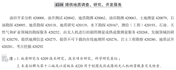 油田开采分析420008; 油井测试420042; 地质勘测420062; 油田勘测420063; 土地测量420079; 石油勘探420095; 地质勘探420118; 地质研究420119; 水下勘探420167; 测绘(工程)420193; 石油、天然气和矿业领域的勘探服务420252; 由无人机进行的制图测量或热成像测量服务420268; 发掘领域的研究420270; 提供地理信息420275; 提供不可下载的在线地理图420276; 岩土工程勘察420280; 地质试井420281; 考古挖掘420292; 地震分析服务; 油层和油田的勘测; 土地测量设计; 土壤分析取样; 油田勘测设计; 进行地理勘测; 地质勘探的设计; 测绘服务; 石油工业的地球物理探测; 考古遗迹发掘; 采矿工业的地球物理探测; 煤气工业的地球物理探测; 矿产分类; 矿产勘探服务; 油田勘测分析; 地质环境工程; 对油井进行诊断; 提供井筒绘图服务; 地形测量; 水文测量; 运用无人机进行地质勘探; 石油、天然气和采矿物的地球物理勘探; 测井服务; 油田分析; 水文研究; 油气勘探; 水下结构物探查服务; 水文地质领域的研究; 自然资源领域的地质研究; 由无人机进行的制图测量服务; 由无人机进行的地形测量服务; 在钻井过程中提供井下遥感勘测服务; 地质测量; 海洋测绘服务; 航空测绘服务; 页岩气开采技术研究; 页岩气勘探; 油田测量; 石油研究分析; 天然气探测; 摄影测量服务;