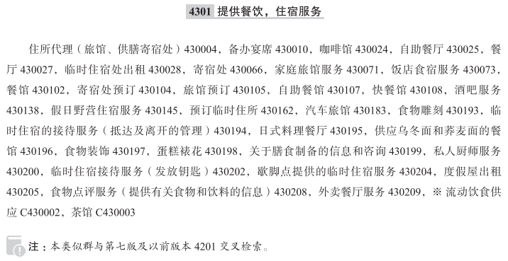 住所代理(旅馆、供膳寄宿处)430004; 备办宴席430010; 咖啡馆430024; 自助餐厅430025; 餐厅430027; 临时住宿处出租430028; 寄宿处430066; 家庭旅馆服务430071; 饭店食宿服务430073; 餐馆430102; 寄宿处预订430104; 旅馆预订430105; 自助餐馆430107; 快餐馆430108; 酒吧服务430138; 假日野营住宿服务430145; 预订临时住所430162; 汽车旅馆430183; 食物雕刻430193; 临时住宿的接待服务(抵达及离开的管理)430194; 日式料理餐厅430195; 供应乌冬面和荞麦面的餐馆430196; 食物装饰430197; 蛋糕裱花430198; 提供关于膳食制备的信息和咨询430199; 关于膳食制备的信息和咨询430199; 私人厨师服务430200; 临时住宿接待服务(发放钥匙)430202; 歇脚点提供的临时住宿服务430204; 度假屋出租430205; 食物点评服务(提供有关食物和饮料的信息)430208; 外卖餐厅服务430209; 流动饮食供应; 茶馆; 纸杯蛋糕装饰; 提供烹饪信息; 提供餐厅在线点评; 果汁吧; 餐馆服务; 在小酒馆内提供食品和饮料; 为展览场所提供备办宴席服务; 在餐馆和酒吧内供应食品和饮料; 在餐馆内为宾客供应食品和饮料; 备办宴会宴席; 流动餐馆服务; 自助餐馆服务; 安排酒店住宿; 包早餐的小旅馆服务; 蛋糕裱花服务; 酒廊的自助餐服务; 为会议中心提供餐饮供应服务; 为教育机构提供餐饮供应服务; 为酒店提供餐饮供应服务; 学校食堂服务; 有关备餐的顾问服务; 饼干装饰; 清酒酒吧; 提供临时住宿; 提供食品和饮料的流动咖啡馆服务; 公司食堂餐饮供应服务; 疗养院餐饮供应服务; 医院餐饮供应服务; 西班牙式菜肴的餐饮供应服务; 欧式菜肴的餐饮供应服务; 日式菜肴的餐饮供应服务; 学校餐饮供应服务; 养老院餐饮供应服务; 酒店提供的餐饮供应服务; 面向优先客户的酒店服务; 调酒服务; 备办宴席领域的咨询服务; 安排临时住宿; 外卖餐馆; 酒吧信息服务; 提供有关临时住宿处服务的信息; 代理预订旅馆; 青年旅社服务; 备办室外宴席服务; 餐馆预订代理; 作为临时住宿处的房间出租; 中餐厅; 酒馆; 度假村住宿服务; 通过互联网提供餐馆服务信息; 茶馆服务; 提供临时住宅性质的应急庇护所服务; 露营场所住宿预订; 在度假村提供临时住宿; 临时住宿处预订代理; 饭店; 提供网络预订餐饮服务的餐厅; 日式餐馆服务; 自助餐厅服务; 比萨店; 冰激凌餐厅; 外卖餐馆服务; 沙拉吧; 鸡尾酒会服务; 临时住宿处预订; 酒店用餐安排; 酒店住宿服务; 通过旅行社预定旅馆; 提供旅馆和汽车旅馆住宿处; 安排并提供临时住宿处; 通过互联网预订临时住宿处; 预订旅馆的旅行社服务; 天妇罗餐馆; 旅馆服务; 小酒馆服务; 食品装饰; 酒店房间预订服务; 朝鲜族风味餐厅; 意式餐厅服务; 秘鲁风味餐厅服务; 旅馆; 有关烹饪食谱的建议; 可提供网络订餐的餐馆; 供应葡萄酒为主的酒吧; 啤酒屋服务; 备办宴席服务; 小餐馆; 通过网站提供旅馆信息; 通过网站提供烹饪信息; 在自酿酒的啤酒馆内供应饮料; 在啤酒作坊内供应饮料; 提供休息室服务; 餐馆信息服务; 咖啡馆服务; 餐厅服务; 为他人预订酒店; 在网吧供应食物和饮料; 寿司餐馆服务; 小旅馆; 餐馆预订服务; 提供网络订餐服务的餐馆; 旅行社代理的旅馆预订; 餐馆预订; 拉面馆; 备办鸡尾酒会; 提供酒吧服务信息; 冰淇淋店(店内食用); 汽车旅馆服务; 自动餐厅; 酒馆服务; 快餐店服务; 通过互联网提供餐厅信息及预订服务; 旅馆休息室服务;