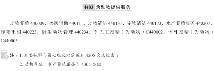 动物养殖440009; 兽医辅助440111; 动物清洁440131; 宠物清洁440173; 水产养殖服务440207; 蜂箱出租440223; 野生动物管理440234; 由兽医实验室提供的兽医诊疗分析服务440285; 人工授精(为动物); 体外授精(为动物); 养猫服务; 牲畜养殖育种服务; 养马服务; 养蜂服务; 养牛服务; 提供兽医信息; 动物卫生保健; 兽医针灸; 以诊断或治疗目的的兽医分析服务; 养猪服务; 为医疗目的对动物进行X光检查; 宠物驱虫服务; 犬养殖服务; 体外授精(替动物); 动物脊椎按摩服务; 动物绝育服务; 动物绝育诊所服务; 试管受精(替动物); 人工授精(替动物); 提供动物养殖相关信息; 为动物提供医疗按摩; 牲畜育种养殖服务; 宠物洗澡服务; 兽医外科; 宠物牙科; 动物美容护理; 养羊服务; 宠物临终关怀服务; 宠物医院服务; 种蛋孵化器出租; 动物烙印; 动物牙科; 狗美容服务; 昆虫养殖服务; 肉兔养殖; 为识别目的替宠物文身; 牲畜配种服务; 马的配种服务; 动物育种; 为诊断或治疗目的进行动物基因检测; 动物饲养服务; 宠物指甲护理服务; 移动式宠物指甲护理服务; 移动式宠物美容服务; 宠物体检服务; 牲畜养殖服务; 宠物美容服务; 宠物营养咨询; 马匹按摩服务; 动物配种服务; 在线提供兽医信息服务; 兽医服务; 奶牛养殖服务; 锦鲤养殖服务; 马养殖服务; 牲畜牧放; 家畜饲养;