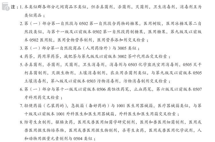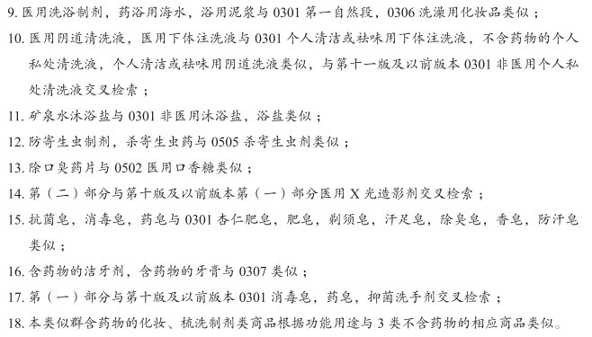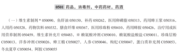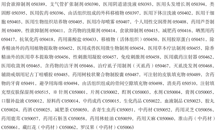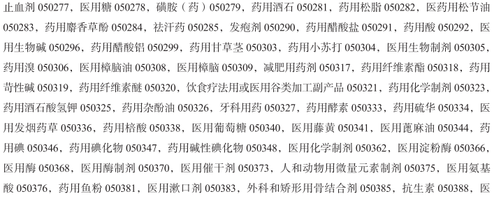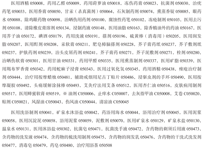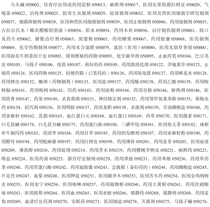 乌头碱050002; 医用酒精050008; 药用乙醛050009; 饮食疗法用或药用淀粉050013; 麻醉剂050017; 药用莳萝油050018; 医用安果斯都拉树皮050020; 气喘茶050022; 冻伤药膏050023; 治痔剂050025; 防寄生虫制剂050029; 抗菌剂050030; 防尿制剂050032; 治疣药笔050033; 医用或兽医用细菌培养肉汤050036; 医用或兽医用细菌培养基050036; 医用或兽医用细菌培养介质050036; 医用及兽医用细菌学研究制剂050037; 细菌抑制剂050038; 医用和兽医用细菌制剂050039; 医用洗浴制剂050041; 矿泉水沐浴盐050042; 浴用氧气050043; 药浴用海水050044; 浴用治疗剂050045; 医用止痛制剂050046; 医用香膏050050; 药用铋制剂050053; 铅水050054; 古拉尔氏水(稀次醋酸铅溶液)050054; 药用木炭050056; 医用沉淀泥050058; 医用泥浆050058; 浴用泥浆050059; 治疗烧伤制剂050061; 除口臭药片050062; 胼胝治疗剂050063; 甘汞(杀真菌剂)050064; 斑蝥粉050065; 药用糖浆050067; 药用胶囊050068; 医药制剂050069; 泥敷剂050070; 石灰制药剂050074; 化学药物制剂050077; 药用水合氯醛050079; 氯仿(医用)050080; 医用无烟草香烟050081; 眼药水050088; 维生素制剂050090; 心电图电极用化学导体050091; 医用南美牛奶菜的干皮050092; 缓和便秘的药物050093; 隐形眼镜护理液050094; 化学避孕剂050095; 医用放射性造影物质050096; 除鸡眼药物050098; 治晒伤用药剂050100; 腐蚀性药笔050102; 冻疮制剂050103; 止血药笔050104; 巴豆茎皮050105; 马钱子050106; 疫苗050107; 医用去污剂050108; 煎好的药050109; 卫生消毒剂050118; 药用助消化剂050122; 洋地黄苷050123; 止痛药050124; 医用药物050125; 轻便药箱(已装药的)050126; 药用氧化镁050127; 药用蜂花水050128; 医用矿泉水050129; 矿泉水盐050130; 温泉水050131; 药用树皮050132; 酏剂(药物制剂)050133; 清除橡皮膏溶剂050134; 医用盐050137; 药用酯050138; 药用乙醚050139; 药用桉树脑050141; 药用桉树050142; 泻药050143; 药用谷粉050144; 药用面粉050144; 解热剂050146; 医用茴香050147; 浸制药液050148; 药茶050149; 鱼肝油050150; 杀真菌剂050151; 神经镇定剂050152; 药用邻甲氧基苯酚050153; 驱肠虫药050154; 轻泻剂050156; 医用明胶050157; 药用龙胆050158; 杀菌剂050159; 甘油磷酸盐050160; 药用亚麻籽050162; 医用油脂050163; 乳脂050165; 怀孕诊断用化学制剂050166; 除香精油外的药油050167; 药油050167; 血红蛋白元050168; 血红蛋白050169; 药草050170; 医用激素050171; 医用芥子油050172; 白毛茛碱050174; 白毛茛分碱050175; 人工授精用精液050177; 碘酒050179; 药用蛋白胨050180; 三碘甲烷050181; 医用角叉菜050182; 球根牵牛制泻药050183; 药浸枣050184; 药用甘草050185; 药用奶发酵剂050187; 药用亚麻籽粉050190; 药用洗液050191; 药用酵母050194; 搽剂050196; 药用蛇麻腺050197; 药用红树皮050199; 药用薄荷050201; 药用麦芽050203; 硫黄棒(消毒用)050205; 医用润发脂050207; 医用酊剂050208; 医用血清050209; 薄荷醇050210; 汞软膏050211; 微生物用营养物质050212; 医用或兽医用微生物培养物050213; 药用锭剂050214; 药用芥末050219; 药用樱桃李树皮050221; 麻醉药050223; 嗅盐050224; 医用药膏050225; 肥皂樟脑搽剂050228; 器官疗法制剂050229; 药用果胶050231; 药用苯酚050236; 芥子膏药纸050237; 芥子敷剂纸050237; 护肤药剂050239; 药用草药茶050240; 治头皮屑药剂050241; 药用胃蛋白酶050242; 药用扁胶囊050243; 急救箱(备好药的)050244; 药用磷酸盐050245; 汗足药050247; 血浆050248; 医用钾盐050251; 医用破斧木050253; 医用苦木药050254; 医用金鸡纳树皮050255; 医用奎宁050256; 医用喹啉050257; 医用放射性物质050258; 医用镭050259; 药用植物根050260; 药用大黄根050261; 补药050262; 药用次硝酸铋050263; 医用菝葜050264; 医用血050265; 医用水蛭050266; 镇静药050268; 镇静剂050268; 药用麦角050269; 血清疗法药剂050270; 芥子膏药050271; 芥子泥敷剂050271; 安眠药050273; 医用钠盐050274; 灭菌剂050275; 马钱子碱050276; 止血剂050277; 医用糖050278; 磺胺(药)050279; 栓剂050280; 药用酒石050281; 药用松脂050282; 医药用松节油050283; 药用麝香草酚050284; 祛汗药050285; 发疱剂050290; 药用醋酸盐050291; 药用酸050292; 医用生物碱050296; 药用醋酸铝050299; 治晒伤软膏050301; 医用沐浴盐050302; 药用甘草茎050303; 药用小苏打050304; 医用生物制剂050305; 药用溴050306; 医用樟脑油050308; 医用樟脑050309; 医用卵磷脂050313; 医用气体050314; 药用蜂王浆050316; 减肥用药剂050317; 药用纤维素酯050318; 药用苛性碱050319; 药用纤维素醚050320; 饮食疗法用或医用谷类加工副产品050321; 药用化学制剂050323; 药用酒石酸氢钾050325; 药用杂酚油050326; 牙科用药050327; 人用药050328; 医用诊断制剂050330; 医用甘油050331; 药物饮料050332; 药用酵素050333; 药用硫华050334; 药用甲醛050335; 医用发烟药草050336; 医用吸入剂050337; 药用棓酸050338; 医用矿脂050339; 医用葡萄糖050340; 医用藤黄050341; 医用羯布罗香膏050342; 药用蛇麻子浸膏050343; 医用蓖麻油050344; 医用过氧化氢050345; 药用碘050346; 药用碘化物050347; 药用碱性碘化物050348; 医用同位素050349; 医用化学制剂050362; 医用或兽医用化学试剂050364; 隐形眼镜清洁剂050365; 医用淀粉酶050366; 膳食纤维050367; 医用酶050368; 医用酶制剂050370; 医用催干剂050373; 人和动物用微量元素制剂050375; 医用氨基酸050376; 药用鱼粉050381; 医用漱口剂050383; 外科和矫形用骨结合剂050385; 抗生素050388; 医用食欲抑制剂050389; 支气管扩张制剂050390; 医用阴道清洗液050393; 医用头发增长剂050394; 类固醇050395; 医用佐药050396; 由活组织组成的