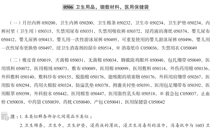 橡皮膏050019; 灭菌棉050031; 无菌棉050034; 脚戴除鸡眼环050040; 包扎绷带050049; 医用填料050072; 医用棉绒050073; 敷布050089; 医用棉050099; 医用敷料050114; 外伤药用棉050136; 外科敷料050140; 敷料纱布050155; 脱脂棉050176; 能吸附的填塞物050176; 卫生内裤050200; 月经内裤050200; 卫生棉条050232; 卫生护垫050234; 卫生巾050234; 外科用肩绷带050267; 医用胶布050294; 内裤衬里(卫生用)050315; 药用火棉胶050324; 失禁用尿布050351; 失禁用吸收裤050372; 浸药液的薄纸050374; 防溢乳垫050378; 拇囊炎衬垫050391; 医用包足绷带布050392; 医用眼罩050398; 婴儿尿布050412; 婴儿尿裤050413; 外科胶水050442; 医用棉签050447; 婴儿用一次性游泳尿裤050495; 可重复使用的婴儿游泳尿裤050496; 婴儿用一次性尿布更换垫050497; 浸卫生消毒剂的湿巾050514; 医用黏性乳头贴050518; 运动贴布用皮肤膜050521; 治疗烧伤用浸渍薄膜050524; 消毒纸巾; 救急包; 止血栓; 中药袋; 药枕; 产包; 医用保健袋; 失禁用衣; 耳用绷带; 浸抗菌制剂的薄纸; 医用纳米银抗菌敷料; 弹性包扎绷带; 烧伤敷料; 一次性婴儿尿布; 包扎用填料; 婴儿游泳尿裤; 皮肤伤口用液体绷带; 自黏敷料; 医用橡皮膏; 抗菌液态绷带; 伤口敷料; 医用鼻咽拭子; 医用口腔拭子; 医用咽拭子; 药棉; 消毒湿巾; 成人尿布; 月经垫; 失禁用一次性尿布; 尿布衬垫; 医用拭子; 无菌敷料; 外科用胶带; 医用胶带; 幼儿和婴儿用一次性游泳尿裤; 创口贴(绷敷材料); 液体绷带喷剂; 急救包; 卫生巾带; 浸药液的卫生纸; 阻止小伤口出血和擦伤出血的可溶性止血条; 一次性消毒湿巾; 医用眼垫; 失禁用护垫; 含药物的敷布;