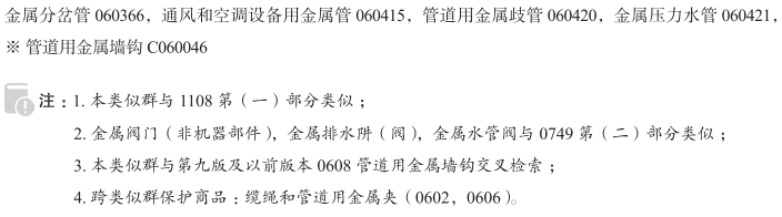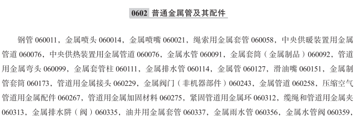 钢管060011; 金属喷头060014; 金属喷嘴060021; 绳索用金属套管060058; 中央供热装置用金属管道060076; 中央供暖装置用金属管道060076; 金属水管060091; 金属套筒(金属制品)060092; 管道用金属弯头060099; 金属套管柱060111; 金属排水管060114; 金属管060127; 滑油嘴060151; 金属制管套筒060173; 管道用金属接头060229; 金属阀门(非机器部件)060243; 金属管道060258; 压缩空气管道用金属配件060267; 管道用金属加固材料060275; 紧固管道用金属环060312; 缆绳和管道用金属夹060313; 金属排水阱(阀)060335; 油井用金属套管060337; 金属雨水管060356; 金属水管阀060359; 金属分岔管060366; 通风和空调设备用金属管060415; 管道用金属歧管060420; 金属压力水管060421; 管道用金属墙钩; 铜管; 金属制空调通风管道; 金属排水阱; 软管用金属弯头; 生铁管; 金属制地下排水管; 通风用金属管; 镍合金管; 压缩空气管用金属配件; 可折叠金属管; 金属分岔管(包括钢钛合金制); 管道金属弯头(包括钢钛合金制); 金属连接管道(包括钢钛合金制); 金属管(包括钢钛合金制); 金属管道(包括钢钛合金制); 金属阀门(非机器零件)(包括钢钛合金制); 建造地下室防水系统用金属排水管道; 金属阀(非机器部件); 通风装置金属管; 液体和气体传送用金属管; 旋转式管道用金属接头; 管道用金属分岔管; 金属制缆绳套管; 金属制管道支架; 金属污水管; 金属制软管夹; 铜合金管; 工业用金属管; 管道用金属连接器; 空调装置金属管; 金属制管夹; 管道用金属夹; 金属阀门(非机器零件); 不锈钢管; 金属套管;