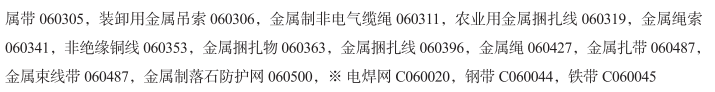 钢箍060003; 钢丝060004; 铝丝060019; 装卸用金属吊带060026; 带刺金属丝060041; 高架缆车的缆绳060057; 普通金属线060108; 铁箍060131; 铁丝060132; 金属丝网060184; 普通金属合金丝(除保险丝外)060268; 包装或捆扎用金属带060285; 捆扎用金属带060285; 捆扎用金属线060286; 装卸用金属带060305; 装卸用金属吊索060306; 金属制非电气缆绳060311; 农业用金属捆扎线060319; 金属绳索060341; 非绝缘铜线060353; 金属捆扎物060363; 金属捆扎线060396; 金属绳060427; 金属扎带060487; 金属束线带060487; 金属制落石防护网060500; 电焊网; 钢带; 铁带; 金属制吊货索; 金属吊索; 捆扎包裹用金属条; 普通金属线(非电气用); 普通金属制非电气用缆绳和线; 金属制网和丝网; 金属薄带; 铁丝织网; 岩滑防护铁丝网; 带刺钢丝网; 不锈钢丝; 带刺铁丝; 钼丝; 滑坡防护用铁丝网; 钨丝; 非电气用单股金属线; 钛丝; 黄铜丝; 钢缆; 钢丝绳;