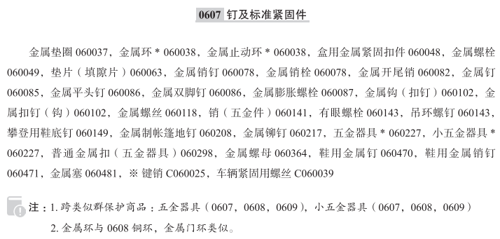 金属垫圈060037; 金属环060038; 金属止动环060038; 盒用金属紧固扣件060048; 金属螺栓060049; 垫片(填隙片)060063; 金属销钉060078; 金属销栓060078; 金属开尾销060082; 金属钉060085; 金属双脚钉060086; 金属平头钉060086; 金属膨胀螺栓060087; 金属钩(扣钉)060102; 金属扣钉(钩)060102; 金属螺丝060118; 销(五金件)060141; 有眼螺栓060143; 吊环螺钉060143; 攀登用鞋底钉060149; 金属制帐篷地钉060208; 金属铆钉060217; 五金器具060227; 小五金器具060227; 普通金属扣(五金器具)060298; 金属螺母060364; 鞋用金属钉060470; 鞋用金属销钉060471; 金属塞060481; 键销; 车辆紧固用螺丝; 固定螺丝用金属制膨胀套管; 模板用金属加固销; 桥梁连接用金属制锚定螺栓; 金属制U型夹扣; 金属锚栓; 金属装饰钉; 金属卡扣; 金属吊环螺钉; 金属六角头螺栓; 固定螺丝用金属胀紧套; 金属销;