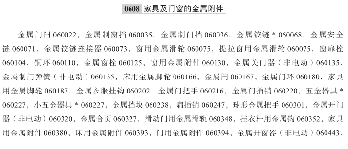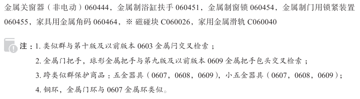 金属门闩060022; 金属制窗挡060035; 金属制门挡060036; 金属铰链060068; 金属安全链060071; 金属铰链连接器060073; 提拉窗用金属滑轮060075; 窗用金属滑轮060075; 窗扉栓060104; 铜环060110; 金属窗栓060125; 窗用金属附件060130; 金属关门器(非电动)060135; 金属制门弹簧(非电动)060135; 床用金属脚轮060166; 金属闩060167; 金属门环060180; 家具用金属脚轮060187; 金属衣服挂钩060202; 金属门把手060216; 金属门插销060220; 小五金器具060227; 五金器具060227; 金属挡块060238; 扁插销060247; 球形金属把手060301; 金属开门器(非电动)060320; 金属合页060327; 滑动门用金属滑轨060348; 挂衣杆用金属钩060352; 家具用金属附件060380; 床用金属附件060393; 门用金属附件060394; 金属开窗器(非电动)060443; 金属关窗器(非电动)060444; 金属制浴缸扶手060451; 金属制窗锁060454; 金属制门用锁紧装置060455; 家具用金属角码060464; 磁碰块; 家用金属滑轨; 金属制淋浴扶手; 金属窗框栓; 普通金属制门把手; 金属制地板铰链; 金属固定式插销; 橱柜用金属阻挡物; 门用金属阻尼器; 金属制门踢板; 窗用金属摇把; 滑动门用金属小滑轮; 柜用金属把手; 金属制邮件口; 金属挂帽钩; 抽屉用金属把手;