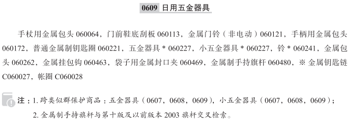 手杖用金属包头060064; 门前鞋底刮板060113; 金属门铃(非电动)060121; 手柄用金属包头060172; 普通金属制钥匙圈060221; 五金器具060227; 小五金器具060227; 铃060241; 金属包头060262; 金属挂包钩060463; 袋子用金属封口夹060469; 金属制手持旗杆060480; 金属钥匙链; 帐圈; 金属钥匙环;