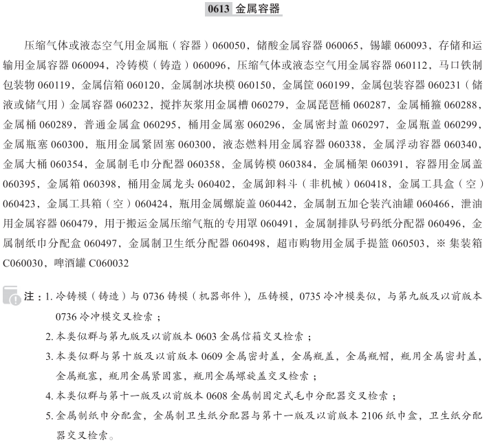 压缩气体或液态空气用金属瓶(容器)060050; 储酸金属容器060065; 锡罐060093; 存储和运输用金属容器060094; 冷铸模(铸造)060096; 压缩气体或液态空气用金属容器060112; 马口铁制包装物060119; 金属信箱060120; 金属制冰块模060150; 金属筐060199; 金属包装容器060231; (储液或储气用)金属容器060232; 搅拌灰浆用金属槽060279; 金属琵琶桶060287; 金属桶箍060288; 金属桶060289; 普通金属盒060295; 桶用金属塞060296; 金属密封盖060297; 金属瓶盖060299; 瓶用金属紧固塞060300; 金属瓶塞060300; 液态燃料用金属容器060338; 金属浮动容器060340; 金属大桶060354; 金属制毛巾分配器060358; 金属铸模060384; 金属桶架060391; 容器用金属盖060395; 金属箱060398; 桶用金属龙头060402; 金属卸料斗(非机械)060418; 金属工具盒(空)060423; 金属工具箱(空)060424; 瓶用金属螺旋盖060442; 金属制五加仑装汽油罐060466; 泄油用金属容器060479; 用于搬运金属压缩气瓶的专用罩060491; 金属制排队号码纸分配器060496; 金属制纸巾分配盒060497; 金属制卫生纸分配器060498; 超市购物用金属手提篮060503; 金属制皂液分配器060506; 存储和运输用金属板条箱060507; 集装箱; 啤酒罐; 压缩气体或液态空气瓶(金属容器); 金属制通用储存容器; 金属制通用储存箱; 陶瓷材料成型用金属模具; 压缩气体或液体用金属圆筒(售时为空); 家用金属制水箱; 瓶用金属塞; 保护植物用金属钟形网罩; 金属饮料罐; 金属盖瓶; 钢丝筐; 金属制工业用贮水箱; 金属液化气罐; 工业包装容器的金属塞; 工业用金属水箱; 液体肥料用金属容器; 金属贮存容器; 贮酸金属容器; 用于压缩气体的金属容器; (贮液或贮气用)金属容器; 瓶用金属密封盖; 钢桶(空的); 钢盒; 气体或液化气体存储罐用铝制内浮盖; 金属储存容器; 压缩气体用金属容器; 金属制工业用储水箱; 金属瓶帽; 金属制饮料罐; 运输用金属容器; 桶用金属活嘴; 啤酒桶用金属龙头; 液化气用金属容器; 钢罐; 金属罐; 金属邮箱; 化学品、压缩气体和液体用金属容器; 金属工具箱; 尿素制造用金属压力容器; 金属制工业包装容器; 金属制固定式毛巾分配器; 储存和运输货物用金属容器; 金属储藏盒; 金属制包装筒;
