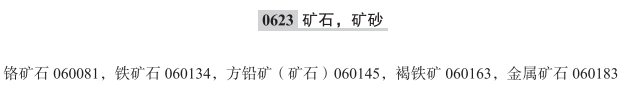 铬矿石060081; 铁矿石060134; 方铅矿(矿石)060145; 褐铁矿060163; 金属矿石060183; 锆矿石; 钴矿石; 黄铁矿砂; 铅砂; 铬铁矿石; 锰矿石; 钨矿石; 镍矿石; 锌矿石; 铜矿石; 锡矿石; 钼矿石;