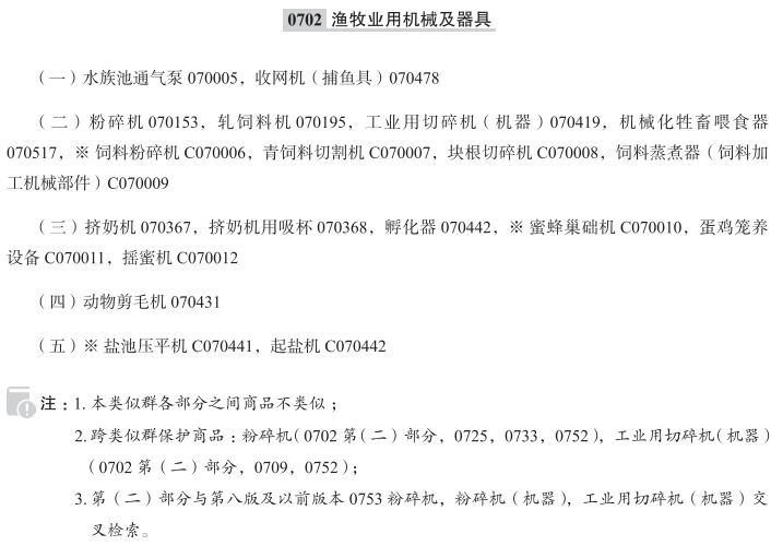 水族池通气泵070005; 粉碎机070153; 轧饲料机070195; 挤奶机070367; 挤奶机用吸杯070368; 工业用切碎机(机器)070419; 动物剪毛机070431; 孵化器070442; 收网机(捕鱼具)070478; 机械化牲畜喂食器070517; 饲料粉碎机; 青饲料切割机; 块根切碎机; 饲料蒸煮器(饲料加工机械部件); 蜜蜂巢础机; 蛋鸡笼养设备; 摇蜜机; 盐池压平机; 起盐机; 遛马机; 草料混合机; 草料切割机; 雏鸡孵化器; 粗茎粉碎机; 电动剪毛机; 动物用电喂食机; 孵蛋器; 孵卵器; 挤奶机用奶头杯; 切碎机; 桑叶切碎机; 水族池用泵; 水族池用造浪泵; 饲料压碎机(饲料磨碎机); 投饵机; 养蚕机器; 鱼塘增氧机; 渔业养殖用增氧机; 渔用增氧机;