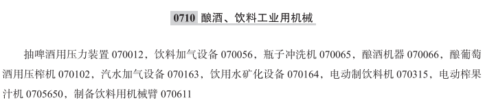 抽啤酒用压力装置070012; 饮料加气设备070056; 瓶子冲洗机070065; 酿酒机器070066; 酿葡萄酒用压榨机070102; 汽水加气设备070163; 饮用水矿化设备070164; 电动制饮料机070315; 电动榨果汁机070565; 制备饮料用机械臂070611; 电动饮料制造机; 电动榨汁机; 汽水饮料制造机; 汽水制造机; 饮料加工机; 制矿泉水机械;