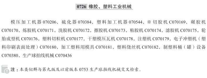 模压加工机器070206; 硫化器070384; 塑料加工机器070544; 切胶机; 碾胶机; 炼胶机; 洗胶机; 擦胶机; 粘胶机; 滤胶机; 轮胎成型机; 塑料切粒机; 干塑模压瓦机; 注塑机; 电子冲塑机(塑料印刷表面处理); 加工塑料用模具; 塑料绕丝机; 制塑料桶(罐)设备; 生产球拍线机械; 混胶辊(橡胶混合机部件); 塑料挤压机; 塑料加工机械; 塑料注射成型机; 橡胶成型机; 橡胶加工机器; 橡胶硫化设备; 橡胶制造机器;