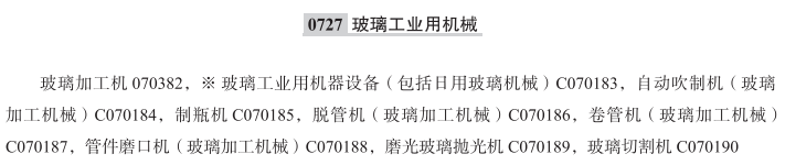 玻璃加工机070382; 玻璃工业用机器设备(包括日用玻璃机械); 自动吹制机(玻璃加工机械); 制瓶机; 脱管机(玻璃加工机械); 卷管机(玻璃加工机械); 管件磨口机(玻璃加工机械); 磨光玻璃抛光机; 玻璃切割机; 玻璃器皿制造机;