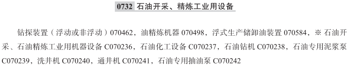 钻探装置(浮动或非浮动)070462; 油精炼机器070498; 浮式生产储卸油装置070584; 石油开采、石油精炼工业用机器设备; 石油化工设备; 石油钻机; 石油专用泥浆泵; 洗井机; 通井机; 石油专用抽油泵; 油井用抽油机; 钻井机; 钻探装置;