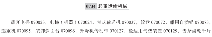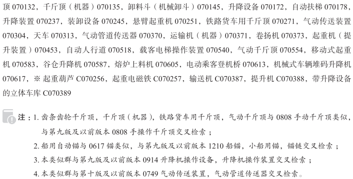 载客电梯070023; 电梯(机器)070024; 带式输送机070037; 绞盘070072; 船用自动锚070073; 起重机070095; 装卸斜面台070096; 搬运用气垫装置070129; 齿条齿轮千斤顶070132; 千斤顶(机器)070135; 卸料斗(机械卸斗)070145; 升降设备070172; 自动扶梯070178; 升降装置070237; 装卸设备070245; 悬臂起重机070251; 铁路货车用千斤顶070271; 气动传送装置070304; 天车070313; 气动管道传送器070370; 运输机(机器)070371; 卷扬机070373; 起重机(提升装置)070453; 自动人行道070518; 载客电梯操作装置070540; 气动千斤顶070554; 移动式起重机070583; 谷仓升降机070587; 熔炉上料机070605; 电动乘客登机桥070613; 机械式车辆堆码升降机070617; 起重葫芦; 起重电磁铁; 输送机; 提升机; 带升降设备的立体车库; 叉式升降机; 车辆用起重机; 船用电动升降机; 电动卷扬机; 电动起重机; 电动千斤顶; 电梯; 电梯(升降机); 电梯操作装置; 电梯门; 吊臂起重机; 动力卷扬机; 堆垛机器; 非手动的千斤顶; 废物材料运输机; 废物和垃圾输送机; 分段输送机; 浮式起重机; 钢丝升降机; 格构式桅杆起重机; 固定起重机和移动式起重机; 固定式起重机; 固体运送机器; 辊道输送机; 海上安装的码头起重机; 货车用千斤顶; 货物装卸机器; 机车起重机; 机电式乘客登机桥; 机械轨道式升降运输机; 机械和气动起重设备; 机械和液压升降机; 机械式起重葫芦; 机械式停车设备; 绞盘机; 卡车起重机; 卡车用千斤顶; 缆绳绞机; 缆索起重机; 链式输送机; 流水线传送机器; 楼梯升降机; 螺旋输送机; 履带式起重机; 门式起重机(桥式吊车); 气动传送器; 气动起重机; 汽车千斤顶; 桥式起重机; 升降工作台(包括可移动的); 升降机(运送滑雪者上坡的装置除外); 升降机操作装置; 升降作业平台; 输送机(机器); 水上起重机; 塔式起重机; 拖网绞机; 卸载起重机; 液压起重机; 液压千斤顶; 液压升降台; 液压运输机; 移动式码头起重机; 移动式升降作业平台; 运输人和货物的起重设备; 装卸机;