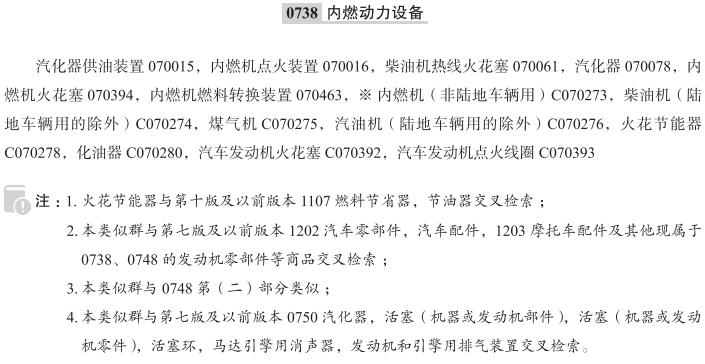 汽化器供油装置070015; 内燃机点火装置070016; 柴油机热线火花塞070061; 汽化器070078; 内燃机火花塞070394; 内燃机燃料转换装置070463; 内燃机(非陆地车辆用); 柴油机(陆地车辆用的除外); 煤气机; 汽油机(陆地车辆用的除外); 火花节能器; 化油器; 汽车发动机火花塞; 汽车发动机点火线圈; 柴油机预热塞; 船用内燃机; 发动机用火花塞; 非陆地车辆用柴油机; 非陆地车辆用火花塞; 非陆地车辆用煤油发动机; 固定内燃机排气系统专用吊架; 固定内燃机排气系统专用托架; 陆地车辆马达用点火装置; 内燃机排气系统用颗粒物空气过滤器; 内燃机燃料喷射设备; 内燃机用活塞; 内燃机用进气歧管; 燃料和空气混合调节器(内燃机部件); 运载工具引擎点火导线;