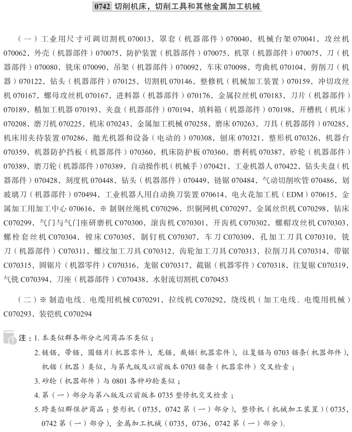 工业用尺寸可调切割机070013; 罩套(机器部件)070040; 机械台架070041; 攻丝机070062; 外壳(机器部件)070075; 防护装置(机器部件)070075; 机罩(机器部件)070075; 刀(机器部件)070080; 铣床070090; 吊架(机器部件)070092; 车床070098; 弯曲机070104; 剪削刀(机器)070122; 钻头(机器部件)070125; 切割机070146; 整修机(机械加工装置)070159; 冲切攻丝机070167; 螺母攻丝机070167; 进料器(机器部件)070176; 金属拉丝机070183; 刀片(机器部件)070189; 精加工机器070193; 夹盘(机器部件)070194; 填料箱(机器部件)070198; 开槽机(机床)070208; 磨刀机070225; 机床070243; 金属加工机械070258; 磨床070263; 刀具(机器部件)070285; 机床用夹持装置070286; 抛光机器和设备(电动的)070308; 刨床070321; 整形机070326; 机器台070359; 机床防护板070360; 机器防护挡板(机器部件)070360; 磨利机070387; 砂轮(机器部件)070389; 磨刀轮(机器部件)070389; 自动操作机(机械手)070421; 工业机器人070422; 钻头夹盘(机器部件)070428; 刻度机070448; 链锯070484; 气动切削吹管070486; 划玻璃刀(机器部件)070494; 工业机器人用自动换刀装置070614; 电火花加工机(EDM)070615; 金属加工用加工中心070616; 制造电线、电缆用机械; 拉线机; 绕线机(加工电线、电缆用机械); 装铠机; 制钢丝绳机; 织铜网机; 金属丝织机; 钻床; 气门与气门座研磨机; 滚齿机; 开齿机; 螺帽攻丝机; 螺栓套丝机; 镗床; 制钉机; 车刀; 孔加工刀具; 铣刀(机器部件); 螺纹加工刀具; 齿轮加工刀具; 拉削刀具; 带锯; 圆锯片(机器零件); 龙锯; 截锯(机器零件); 往复锯; 气铣; 刀座(机器部件); 水射流切割机; 车床(金属加工); 齿轮刀具(机械工具); 齿轮切削和修整机; 处理陶瓷和金属的研磨机; 电动链锯; 电动碾磨机用页盘; 电动抛光机; 电锯; 电缆绕线机; 电砂轮机用砂轮; 电钻的钻头; 电钻卡盘; 电钻用钻头; 电钻用钻头夹盘; 定心钻头(机器部件); 动力驱动的磨光器; 工具磨床; 工业用机械臂; 珩磨机(金属加工机械); 滑雪橇用电动磨利机; 机床用模具; 剪切机(金属加工用); 渐开线磨床; 铰床; 金属成型机; 金属加工机械的刀夹(机器部件); 金属加工机械用刀头; 金属加工用插床; 金属加工用车床; 金属加工用成型机; 金属加工用管磨机; 金属加工用珩磨机; 金属加工用机床; 金属加工用剪切机; 金属加工用精研机; 金属加工用拉床; 金属加工用磨床; 金属加工用刨床; 金属加工用切割机; 金属加工用镗床; 金属加工用弯曲机; 金属加工用铣床; 金属加工用组合加工中心机床; 金属加工用钻床; 金属锯床; 金属拉线机; 金属线材成型机; 金属线材挤压成型机; 精研机(金属加工用); 拉床(机器); 拉削刀(机械工具); 立铣刀; 螺纹磨床; 螺纹梳刀(机械工具); 螺纹铣刀(机械工具); 螺旋伞齿轮研磨机; 模切机; 磨床(金属加工); 内表面磨床; 抛丸清理机; 刨槽机; 刨削机(金属加工); 配钥匙机; 喷砂机; 喷砂装置; 切割机(金属加工用); 切割设备(机器部件); 砂带打磨机; 铣床(金属加工用); 铣床用铣刀; 铣刀(机械工具); 铣钻床; 线材卷绕机; 旋转磨床; 摇臂钻; 用于处理陶瓷和金属的铣床; 与机床配套使用的硬质合金刀尖; 圆锯; 制钥匙机; 钻孔机; 钻头刃磨机;
