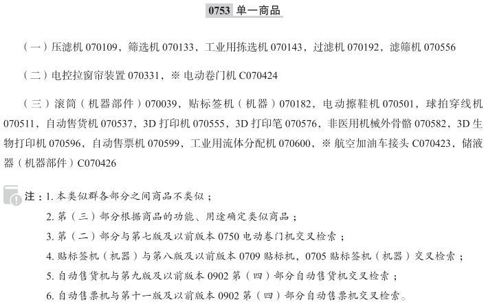 滚筒(机器部件)070039; 压滤机070109; 筛选机070133; 工业用拣选机070143; 贴标签机(机器)070182; 过滤机070192; 电控拉窗帘装置070331; 电动擦鞋机070501; 球拍穿线机070511; 自动售货机070537; 3D打印机070555; 滤筛机070556; 3D打印笔070576; 非医用机械外骨骼070582; 3D生物打印机070596; 自动售票机070599; 工业用流体分配机070600; 航空加油车接头; 电动卷门机; 储液器(机器部件); 冰面打磨机; 稻谷分选机; 工业用自动叠衣机; 化学加工用过滤机; 化学加工用拣选机; 化学加工用压滤机; 冷藏式自动售货机; 轮胎平衡机; 牛奶过滤机; 筛分机; 陶瓷3D打印机; 制动液更换加注机; 贮液器(机器部件); 自动拆装轮胎装置; 自动售糖果机;
