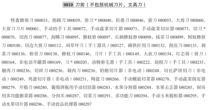 牲畜修剪刀080033; 削蹄刀080039; 剪刀080040; 折叠刀080046; 猎刀080053; 大剪刀080060; 大剪刀刀片080061; 手动的手工具080072; 手动蔬菜切片器080073; 手动蔬菜切丝器080073; 切刀080076; 切肉刀080077; 刮鳞刀080095; 修枝剪080097; 长柄修枝剪080098; 接芽刀080099; 树枝修剪刀080100; 切边大剪刀080112; 刈草坪刀(手工器具)080127; 蹄铁匠用刀080132; 削皮刀080133; 剁菜刀080136; 斩骨刀080138; 修枝刀080146; 刀片(手工具)080149; 大砍刀080154; 灯芯剪(剪刀)080164; 非电动开罐器080169; 刀080205; 动物剪毛器(手工具)080222; 刮削刀(手工具)080235; 切碎刀080236; 剔肉刀080236; 剁肉刀080236; 奶酪切片器(非电动)080248; 切比萨饼用刀(非电动)080249; 鸡蛋切片器(非电动)080251; 陶瓷刀080266; 手动螺旋切菜器080278; 手动蔬菜削皮器080279; 开箱刀080280; 葡萄酒瓶用手动切箔器080283; 水果分割器080284; 水果去芯器080285; 厨房用多功能擦菜器080286; 分肉爪080287; 切菜刀080291; 多功能刀080294; 手动玉米脱粒器080295; 手动水果切片器080296; 手动食品处理器080297; 手动水果去核器080301; 拆线刀080304; 非电动剥橙器; 厨房用刀具; 鱼线剪刀; 刮鱼鳞器; 家禽剪刀; 刀(手工具); 奶酪切片器(非电); 家用刀; 铁皮剪; 渔刀; 纱剪; 潜水刀; 厨师刀; 户外运动刀; 钓鱼线剪刀; 可生物降解的刀; 手动鱼鳞刨; 大折合刀; 切葡萄柚刀; 油漆刮刀(手工具); 层压板刻痕刀; 蛋糕切刀; 水果刀; 水果雕刻刀; 葡萄柚树修剪器; 薯条切刀; 比萨饼切片器; 开罐头刀; 削木刀; 面包刀; 手动锡剪; 手动铁皮剪; 鱼刮鳞器; 金属剪切用剪刀(铁皮剪); 切比萨用刀(非电); 潜水刀盒; 狗用修剪工具; 裁缝用粉笔削刀; 绣花剪刀; 剁榻榻米垫用刀; 片鱼厨刀; 插花用剪刀; 针线剪刀; 鸡蛋切片器(非电); 手动菠萝挖眼器; 切碎刀(手工具); 非电动削皮器; 地毯刀; 切比萨饼用刀(非电); 非电动奶酪切片机; 薄刃厨房刀; 小型长柄砍刀(手工具); 切硬面包圈用刀; 意式面食制作用手动切割器; 非电动切比萨饼用刀; 手动香蕉切片器; 比萨饼剪刀; 苹果去芯器; 蔬菜削皮器(手工具); 小折刀; 齿牙剪; 大蒜切碎器(非电); 切蒜器(非电); 土豆削皮器(非电); 斜切刀(手工具); 非电动奶酪切片器; 非电动鸡蛋切片器; 缝纫剪; 苹果去核器; 文具剪刀; 砍刀; 烛芯剪; 儿童用剪刀; 缝纫用剪刀; 非电动蔬菜剥皮器; 手动剪毛器; 手动切碎机; 小剪刀; 蔬菜切丝器; 剪纸刀; 修枝用大剪刀; 非电动食品切片器; 切片刀; 园艺用大剪刀; 刀套; 家用大剪刀; 削皮器; 剪刀刀片; 水果削皮器; 皮刀鞘; 羊毛剪; 刀鞘; 剪刀刀刃; 蔬菜去心器; 园艺剪刀; 蔬菜切片器; 剔肉刀(手工具); 厨房用剪刀; 家用剪刀;