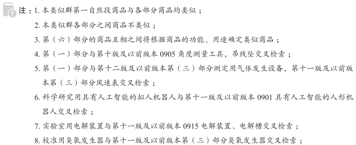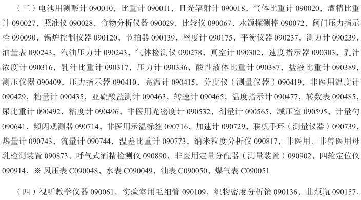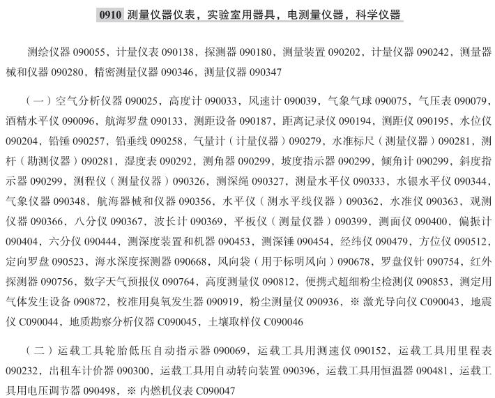 粒子加速器090002; 电池用测酸计090010; 比重计090011; 日光辐射计090018; 气体比重计090020; 空气分析仪器090025; 酒精比重计090027; 照准仪090028; 食物分析仪器090029; 高度计090033; 安培计090036; 风速计090039; 测绘仪器090055; 视听教学仪器090061; 比较仪090067; 运载工具轮胎低压自动指示器090069; 水源探测棒090072; 气象气球090075; 气压表090079; 电子回旋加速器090085; 阀门压力指示栓090090; 电流计090092; 酒精水平仪090096; 实验室用毛细管090109; 锅炉控制仪器090120; 航海罗盘090133; 织物密度分析镜090136; 计量仪表090138; 节拍器090139; 运载工具用测速仪090152; 曲颈瓶090157; 曲颈瓶座090158; 宇宙学仪器090161; 坩埚(实验室用)090170; 烤钵(实验室用)090170; 回旋加速器090172; 密度计090175; 实验室料盘090177; 工业或军用金属探测器090178; 探测器090180; 测距设备090187; 距离记录仪090194; 测距仪090195; 测量装置090202; 功率计090203; 水位仪090204; 电损耗指示器090213; 电测量仪器090214; 运载工具用里程表090232; 试管090236; 平衡仪器090237; 测力计090239; 材料检验仪器和机器090240; 计量仪器090242; 汽油压力计090243; 油量表090243; 非医用测试仪090249; 实验室用发酵装置090253; 铅锤090257; 铅垂线090258; 高频仪器090267; 频率计090268; 气体检测仪090278; 气量计(计量仪器)090279; 测量器械和仪器090280; 水准标尺(测量仪器)090281; 测杆(勘测仪器)090281; 分度玻璃器皿090285; 计量用玻璃器皿090285; 湿度表090292; 斜度指示器090299; 倾角计090299; 坡度指示器090299; 测角器090299; 出租车计价器090300; 真空计090302; 速度指示器090303; 实验室用特制家具090315; 乳汁浓度计090316; 乳汁比重计090317; 非医用激光器090323; 测程仪(测量仪器)090326; 测深绳090327; 测量水平仪090333; 压力计090336; 数学仪器090339; 水银水平仪090344; 精密测量仪器090346; 测量仪器090347; 气象仪器090348; 显微镜用薄片切片机090352; 航海器械和仪器090356; 水平仪(测水平线仪器)090362; 水准仪090363; 观测仪器090366; 八分仪090367; 欧姆计090368; 波长计090369; 示波器090374; 酸性液体比重计090387; 盐液比重计090389; 物理学设备和仪器090395; 运载工具用自动转向装置090396; 实验室用吸量管090398; 平板仪(测量仪器)090399; 测面仪090400; 偏振计090404; 测压仪器090409; 压力指示器090410; 高温计090415; 分度仪(测量仪器)090419; 非医用温度计090429; 糖量计090435; 科学用探测器090436; 科学卫星090437; 科学装置用隔膜090439; 教学仪器090440; 六分仪090444; 运载工具驾驶和控制模拟器090448; 测深度装置和机器090453; 测深锤090454; 球径计090458; 亚硫酸盐测计090463; 转速计090465; 温度指示计090477; 经纬仪090479; 运载工具用恒温器090481; 转数表090485; 尿比重计090492; 粘度计090496; 运载工具用电压调节器090498; 伏特计090500; 实验室用蒸馏器090504; 方位仪090512; 定向罗盘090523; 非医用光密度计090532; 化学仪器和器具090549; 细菌培养器090556; 科学用蒸馏装置090564; 剂量计090565; 实验室用炉090568; 实验室用烘箱090568; 实验室用层析设备090585; 减压室090595; 非医用诊断设备090633; 计量勺090641; 海水深度探测器090668; 风向袋(用于标明风向)090678; 急救训练用人体模型(教学器具)090680; 基因芯片(DNA芯片)090684; 撞击试验用假人090697; 实验室用离心机090698; 培养皿090712; 皮托管090713; 频闪观测器090714; 非医用示温标签090716; 加速计090729; 联机手环(测量仪器)090739; 热量计090743; 流量计090744; 罗盘仪针090754; 红外探测器090756; 数字天气预报仪090764; 温差比重计090773; 生物芯片090774; 科学研究用具有人工智能的拟人机器人090778; 实验室机器人090787; 教学机器人090788; 复苏训练模拟器090798; 非医用磁共振成像(MRI)装置090808; 高度测量仪090812; 美发培训用头模(教学仪器)090813; 纳米粒度分析仪090817; 非医用、非家用测量滴管090827; 便携式超细粉尘检测仪090853; 汽车诊断用扫描设备090859; 实验室用电解装置090871; 测定用气体发生设备090872; 非医用、非兽医用母乳检测装置090873; 实验室用生物反应器090879; 科学研究用细胞培养生物反应器090880; 呼气式酒精检测仪090890; 非医用定量分配器(测量装置)090902; 四轮定位仪090914; 校准用臭氧发生器090919; 实验室用滴定管090926; 探空火箭090931; 粉尘测量仪090936; 研究性实验室用诊断设备090937; 非医用超声成像设备090938; 医学培训模拟器090949; 实验室用烧瓶090959; 实验室用化学反应器090960; 用于实验室科学研究的基因扩增装置090964; 激光导向仪; 地震仪; 地质勘察分析仪器; 土壤取样仪; 内燃机仪表; 风压表; 水表; 油表; 煤气表; 理化试验和成分分析用仪器和量器; 酒精灯; 电度表; 试电笔; 成套电气校验装置; 电气测量用稳压器; 核原子发电站控制系统; 原子射线仪器; 核子仪器; 导弹控制盒; DNA微阵列; X光安检机; X光全身扫描安检仪; X射线衍射分析仪; X射线荧光分析仪; X射线荧光光谱仪分析器; 安时计; 熬糖用温度计; 半导体测试设备; 半导体测试用探针; 半导体检测机; 被动红外探测器; 比色计; 玻璃量器; 不透明度监测器; 测定肉内层温度用温度计; 测缝计; 测谎仪; 测量罗盘针; 测量仪器用三脚架; 测量用激光器; 测试食物用诊断设备; 测试仪器; 测振仪; 柴油机喷油器测试仪; 柴油排放测试器; 超声波探伤仪; 超声探伤仪; 车辆用超声波物体探测器; 车轮定位仪; 出租车电子计程器; 磁力计; 磁性回转罗盘; 磁性罗盘; 磁性罗盘(测量用); 磁性物体探测器; 蛋白